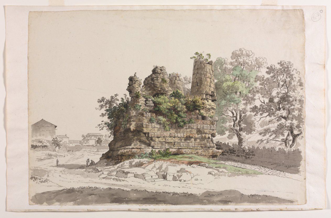 The So-Called Sepulcher of the Curiatii Brothers at Albano, with the Church of the Madonna della Stella in the distance at left by Carlo Labruzzi — VisualArtsDB
