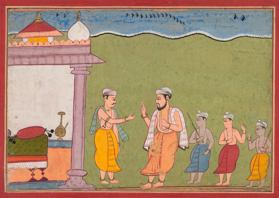 Three cowherd boys stand behind their village elder Nanda, who agrees to hide the newborn Krishna, an incarnation of a Hindu god. At the left is Krishna’s father, Vasudeva, who has made this request in order to protect the child from slaughter by the despotic king, who had heard a prophecy that Krishna would one day kill him. This painting is from a series depicting scenes from a sacred Hindu text and was part of the royal Bikaner collection. The simple, geometric composition, profile views, and flat planes of color show adherence to long-standing local artistic styles.