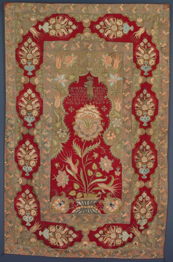 This rare Ottoman embroidery features a floral bouquet that enriches the field under an elegant arch of gilt-metal thread. Flanked by vines of tulips and irises on a silver-metal-thread ground, vases of tulips and jonquils within cartouches adorn the main border and the well-turned corners, a sign of high quality. Dated 1763, the textile documents a mid-18th-century style and technique uncommon in Ottoman embroideries. The Armenian community commissioned this pattern for a liturgical curtain. Beneath the arch, Saint John the Baptist appears with a staff of victory, holding his own severed head in one arm and the Lamb of God in the other. The embroidered Armenian inscription reads: "This curtain is in memory of the people of Hassan Pasha Khan who gave it to the Monastery of Saint John the Baptist on the Armenian date 10 May 1212 [1763]."