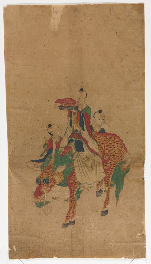 By the late 18th century, subjects that deal with Daoist immortals and their fantasy stories were increasingly chosen for paintings. For their wish-granting message, Daoist figure paintings such as this one were often commissioned to celebrate festive occasions. Judging from its dimension, this paining used to be part of either a small-size multi-panel folding screen or a large-size album that depicts a series of Daoist immortals and Buddhist deities.