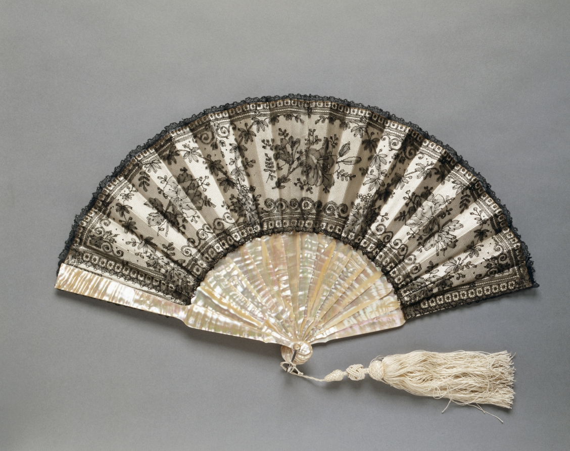 black "Chantilly" lace over silk lining, white silk tassel; frame: mother-of-pearl