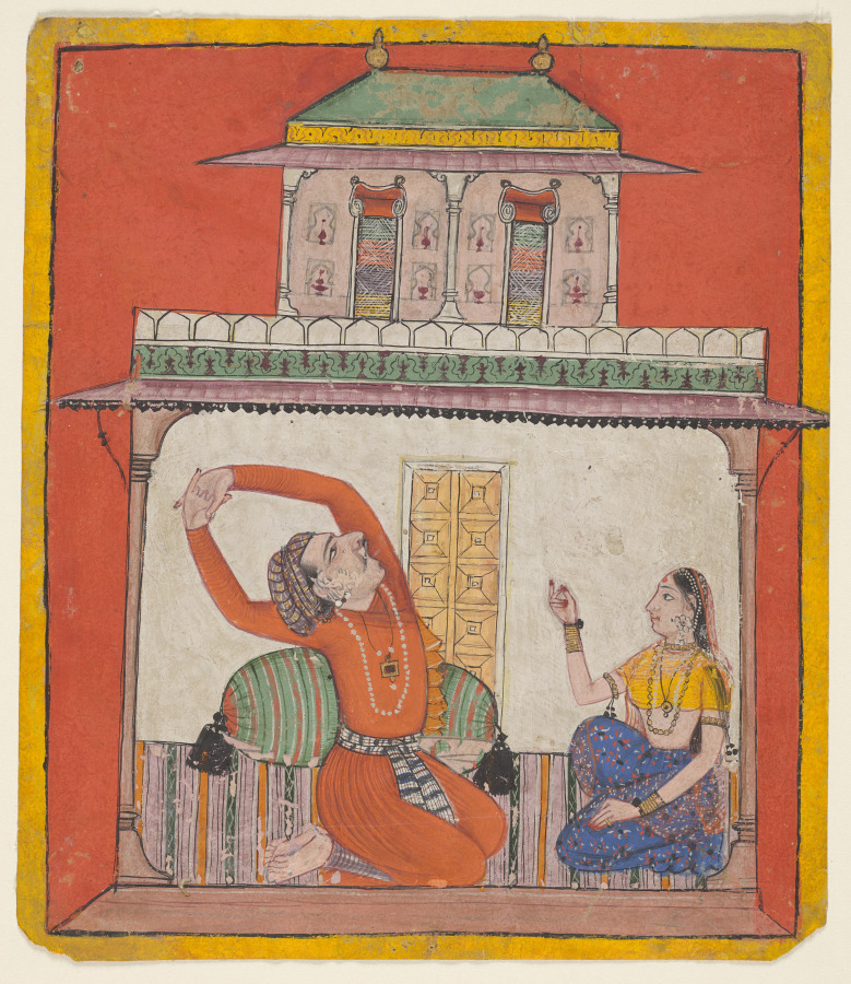 A couple sits on a striped carpet (durri) inside a brightly lit chamber. The man stretches his arms, apparently having just awoken, while the woman kneels before him in a gesture of address. Architectural details on the second floor include niches for bottles and red curtains rolled up to allow a breeze to pass through colorful bamboo screens.