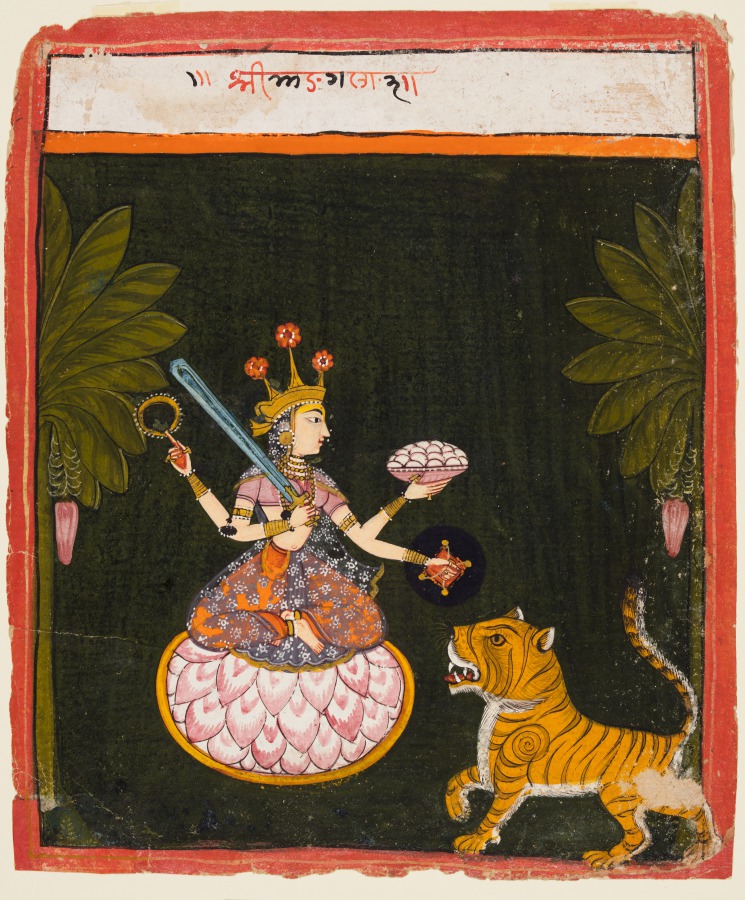 The four-armed goddess sits on an open lotus against a dark green background. She holds a discus, sword, bowl of cakes, and a shield. Banana trees flank her, and her tiger mount stands beneath. The subject in the painting appears to be a regional form of the Devi, as the name “Mangala” does not appear in major Hindu scriptures.