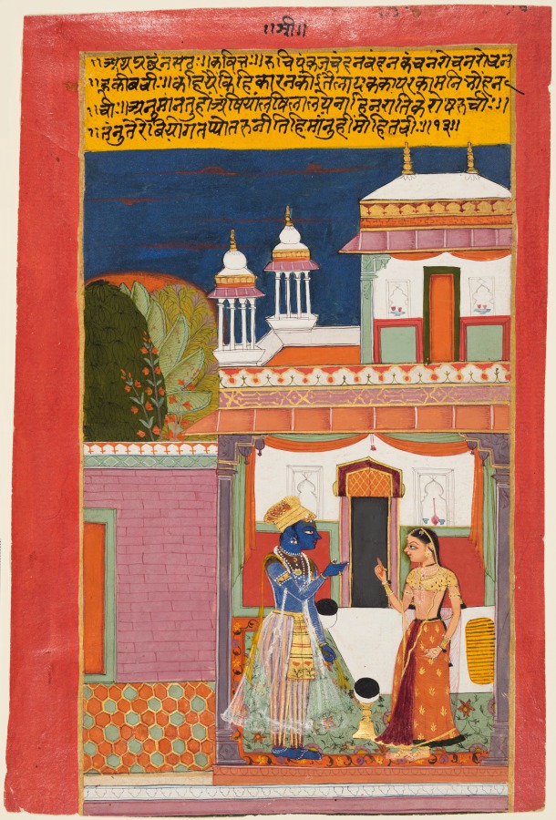 When Krishna returns home at dawn, having spent the night elsewhere, an infuriated Radha inquires about his whereabouts and accuses him of infidelity. Krishna, realizing the intensity of the situation, tries to assuage her with sweet words and compares her red eyes to lotus petals. The rising sun behind the thick foliage is suggestive of early dawn.
