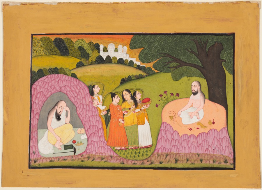 Sultan Ibrahim ibn Adham was the King of Balkh in present-day Afghanistan, born around 730, but later abdicated his throne to take up ascetic life in Syria. Sufi legends claim that Ibrahim in the wilderness was fed by angels. In the painting, Ibrahim can be seen in a cave and meditating under a tree, while five angles appear in front of him.