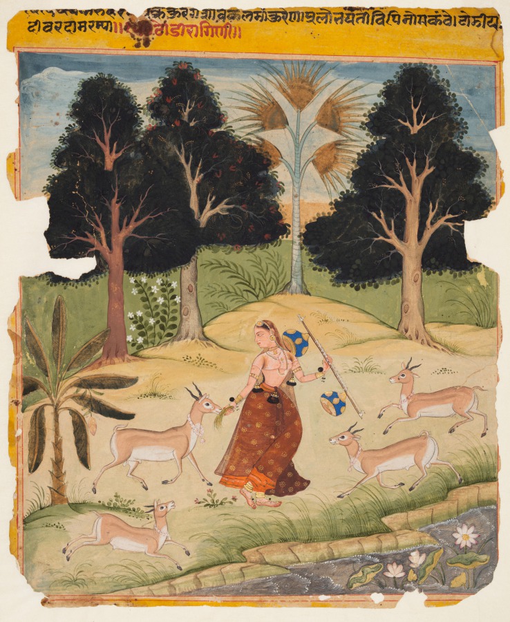 The lone woman wears an orange skirt under a sheer brown sari with gold patterns. She offers some grass to one of four deer that approach her with enthusiasm. She holds a blue and gold vina and faces to the viewer’s left. A poetic verse in Sanskrit describing Ragini Todi is inscribed within the upper yellow border.