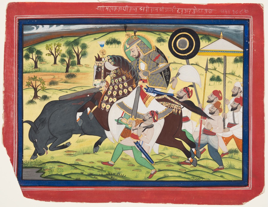 In an energized hunting scene, the equestrian Maharaja Ram Singh smites a running buffalo with his sword. The Maharaja is supported by a hunting party, who carry various objects for the Rajput king’s vanity, including additional swords, a fly whisk, a parasol, and a canopy.