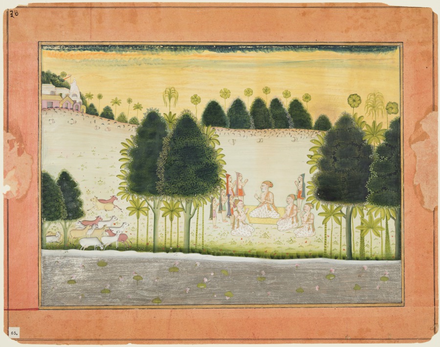 The glowing hues and exquisite treatment of the figures and vegetation transport the viewer to the mythic realm of the Hindu god Krishna. Nanda, the lead elder of the cowherder village, sits amid the village council, larger than the others. After witnessing the divine and superhuman activities of Krishna, the cowherders approached Nanda and asked him for an explanation.
