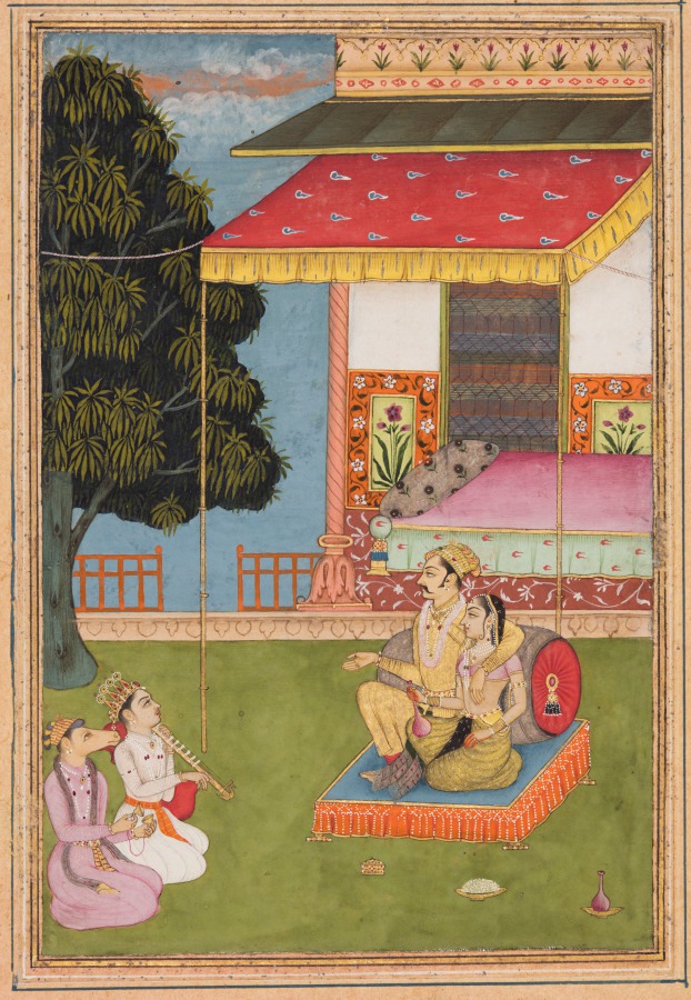 Sharing a bottle of wine, the royal couple enjoy the performance of a musician playing a vina and the horse-headed divinity Tumbaru on the cymbals. Tumbaru is a divinity who has the power to increase the prosperity of the realm. This page is from a series that was made on the occasion of Diwali, the Hindu festival of lights.