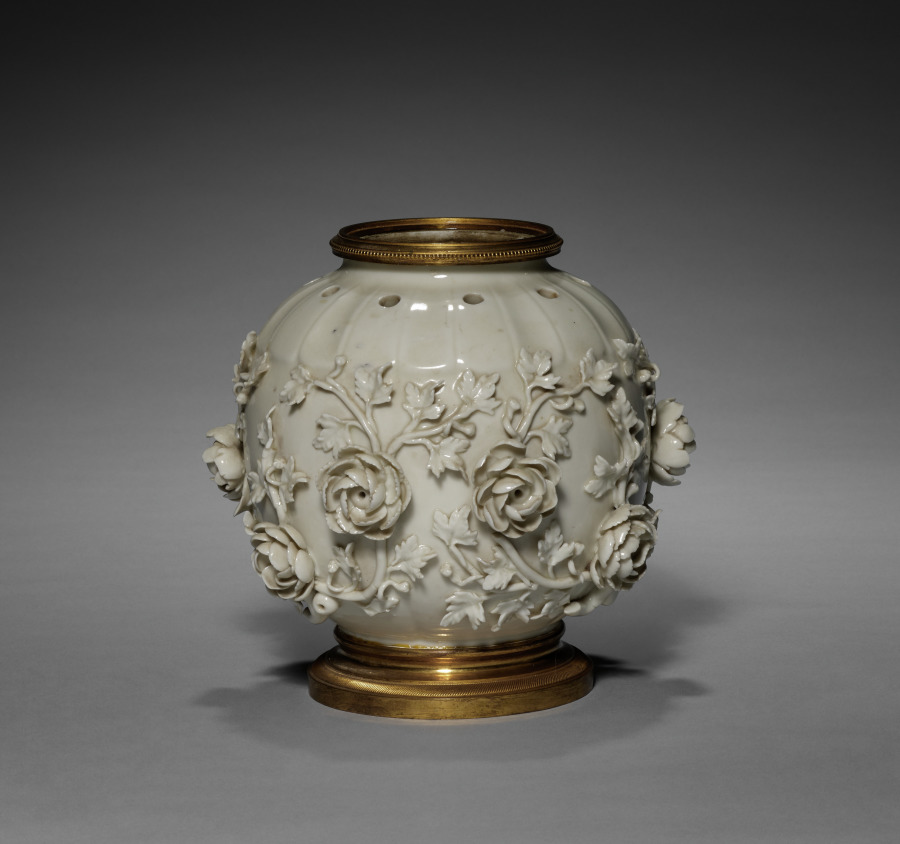 This vase—part of a pair of covered vases—was created to contain potpourri, a mixture of flowers, herbs, and spices emitting ambient fragrance. This specific function offered a particularly fertile ground for the development of French porcelain from the mid-1700s, as manufactories experimented with forms, surface ornamentations, and placement of perforations. Produced by the firm of Edmé Samson in the 1800s, the vases pay homage to this history. While using updated technique and material, as well as more exuberant decorations, these vases draw upon designs by earlier innovators such as the Saint-Cloud manufactory.