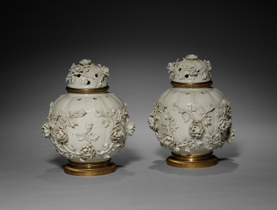 These vases were likely made by the celebrated Parisian ceramics firm of Edmé Samson (1810-91). To cater to the resurgence in taste for 18th-century designs, the Samson firm specialized in making reproductions of rare 18th-century European porcelains, especially those from firms that had already copied Chinese porcelains. In this case, these vases are designs taken from models produced by the St. Cloud factory in the 1750s after earlier Qing dynasty Chinese ceramics. However, the telltale sign that these vases are made by Samson and not St. Cloud is that the originals would have been made from a soft-paste porcelain (fired at a lower temperature), while these examples are made of hard-paste porcelain (fired at the highest temperature).