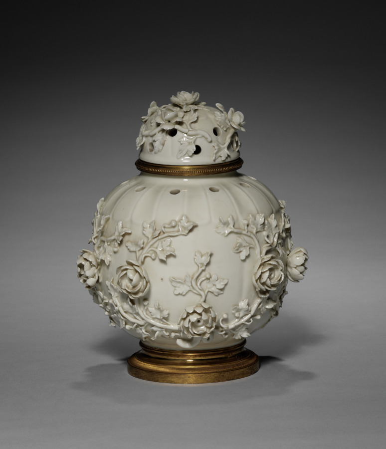 This vase was likely made by the celebrated Parisian ceramics firm of Edmé Samson (1810–91). To cater to the resurgence in taste for 18th-century designs, the Samson firm specialized in making reproductions of rare 18th-century European porcelains, especially those from firms that had already copied Chinese porcelains. In this case, this vase's design is taken from models produced by the Saint-Cloud factory in the 1750s after earlier Qing dynasty Chinese ceramics. However, the telltale sign that this vase is made by Samson and not Saint-Cloud is that the original would have been made from a soft-paste porcelain (fired at a lower temperature), while this example is made of hard-paste porcelain (fired at the highest temperature).