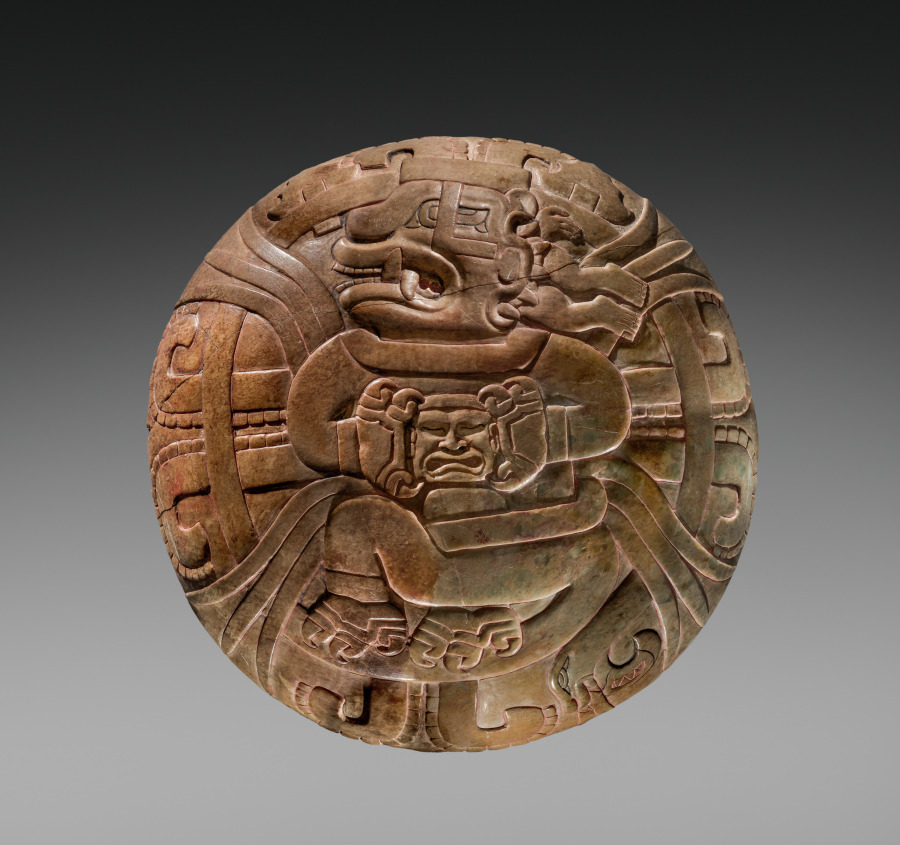 This plate is carved with a feline supernatural sacrificer who holds a severed human head in its clawed paws. The diagonal clusters of plant foliage at the figure’s shoulders and hips imply that death is tied to the earth’s fertility, one being a precondition for the other. The figure, therefore, may be an apotheosis of the life-death cycle.