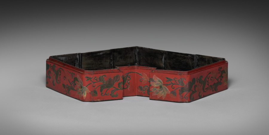 red lacquer over a wood core, with litharge painting and engraved gold designs (Ryukyuan)