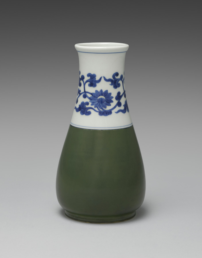 The upper part of this vase is painted in underglaze blue with a floral scroll of leaves accentuated with a single chrysanthemum motif on each face and bound at top and bottom with single blue lines. The box lid for the vase is short on detail; the inscription notes only that it is a flower vase with underglaze blue. It is possible that the box is a mismatch because the inscription does not mention the vase’s more distinctive feature: the deep green glaze on its lower half, which is seen much less frequently among Yohei III’s works. This glaze may be an example of a dark green porcelain glaze called rōkanji, which the artist invented in 1892. The name of the glaze comes from Chinese, in which it is pronounced langgan. It may literally mean “tinkling sound of jade” and could refer to malachite, among other proposed identifications.