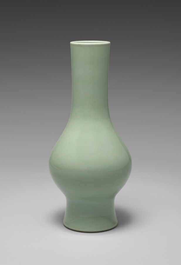 This flower vase has a tall, slightly flared foot and bulbous body with a slimmer neck. It is completely undecorated but for the hisoku, or “mysterious color,” glaze. Its box lid has a red seal with a flower on it, a rather unusual feature also seen on the box for the green-glazed water container that belonged to the Hosokawa family (see CMA 2022.197 [http://www.clevelandart.org/art/2022.197]).