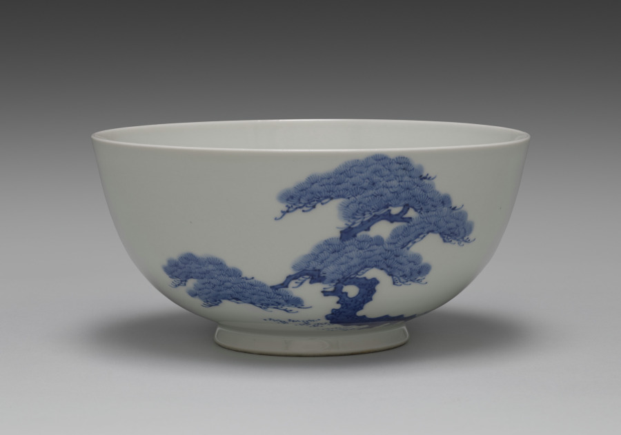 The bowl has slightly more detailed surface designs painted in blue under the glaze than some other Yohei III's other teaware, like the Water Cooler with Pines, CMA 2022.163 [http://www.clevelandart.org/art/2022.163]. The three pines, with two, three, and four racks of boughs respectively, have more angular rather than curved trunks, with clearly articulated bark.