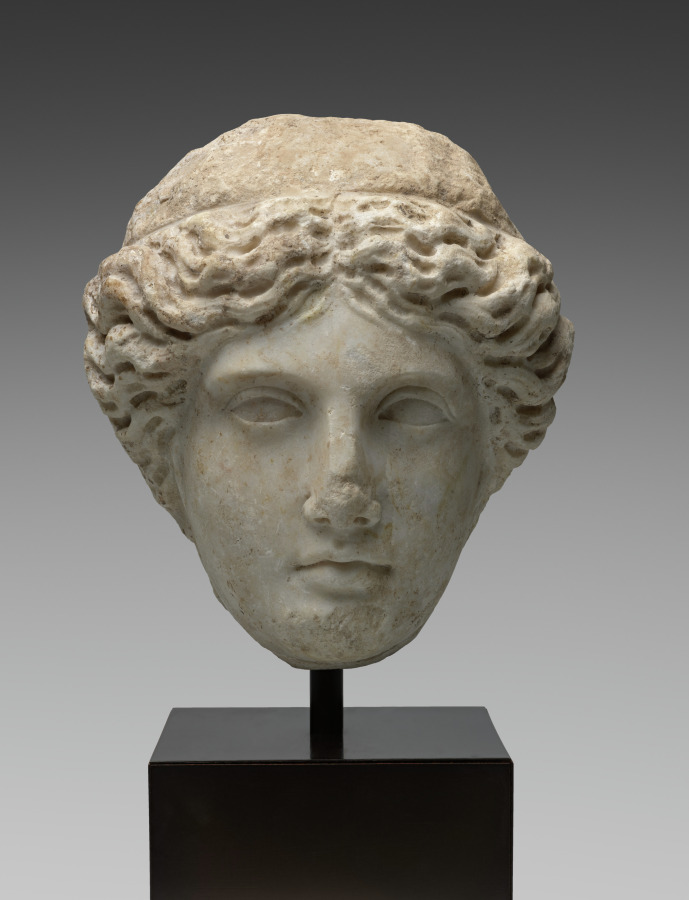 This marble head, about three-quarter life-sized with idealized features, likely represents Apollo, the god most renowned for his youthful beauty. The hair spreads from a central part, flowing to either side in long and deeply drilled locks that cover the ears. An incised line separates these locks from a rougher area above, probably reserved for a separately made diadem or wreath, likely of metal.