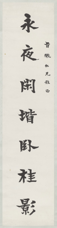 The prominent politician and modern reformer Liang Qichao writes here in an angular, firm, and little modulated regular script style, inspired by inscriptions incised on ancient stone steles. Those script styles were popular among reformers of the time, as they sought to revive the ancient culture and built a new China on the country’s strong ancient foundations. Each scroll cites the verse of a historic cultural figure in Chinese history.