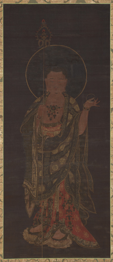 This fourteenth-century hanging scroll depicts Kṣitigarbha (지장보살), the Bodhisattva of Salvation in the guise of a youthful Buddhist monk. Clad in simple monastic robes, he holds a staff to announce his presence and a wish-fulfilling jewel symbolizing his vow to relieve suffering. Kṣitigarbha is believed to descend into the underworld to guide and liberate tormented souls trapped in purgatory. His compassionate mission made him a key figure in both East Asian visual and ritual tradition.