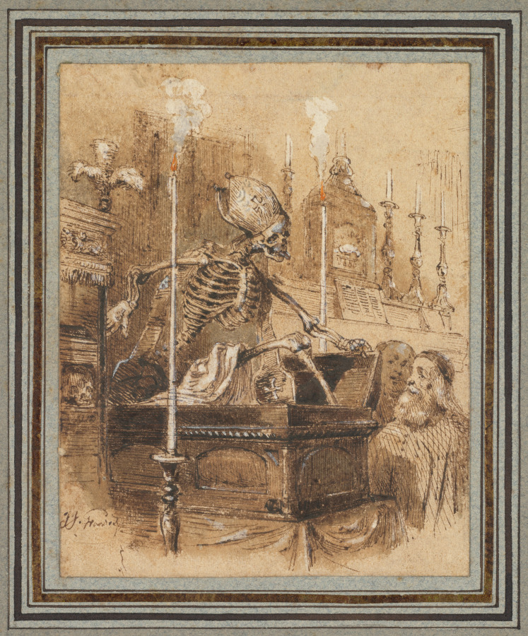 Grandville was known for the many illustrations he contributed to books and periodicals, often in a creative, fantastic style. This drawing relates to an image that appeared in an 1835 edition of the popular songwriter Pierre Jean de Béranger’s complete works. It accompanied the lyrics to a macabre song entitled Les Reliques, written in the voice of the skeleton who appears in the image.