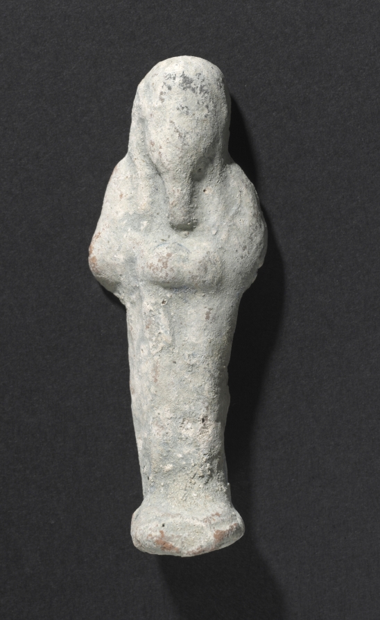 High demand for shawabtys in the Late Period, a time when as many as 400 or more shawabtys were placed in the tomb with the deceased, gave rise to a specialized container for storing them: the shawabty box. This example is inscribed for the lady of the house, Ditamenpaankh, and was probably one of a pair originally made for her. The single-masted boat on the box's lid is perhaps an allusion to the pilgrimage of the deceased to the holy city of Abydos, the cult city of Osiris, king of the dead. The shawabtys inside are crude, mass-produced examples cast in an open mold. Made of terracotta, their blue paint imitates more costly shawabtys made of faience. As for the shawabty spell, it has been removed from its traditional location on the shawabty's front and relocated onto the sides of box, where it needed only to be written once, thus expediting production.