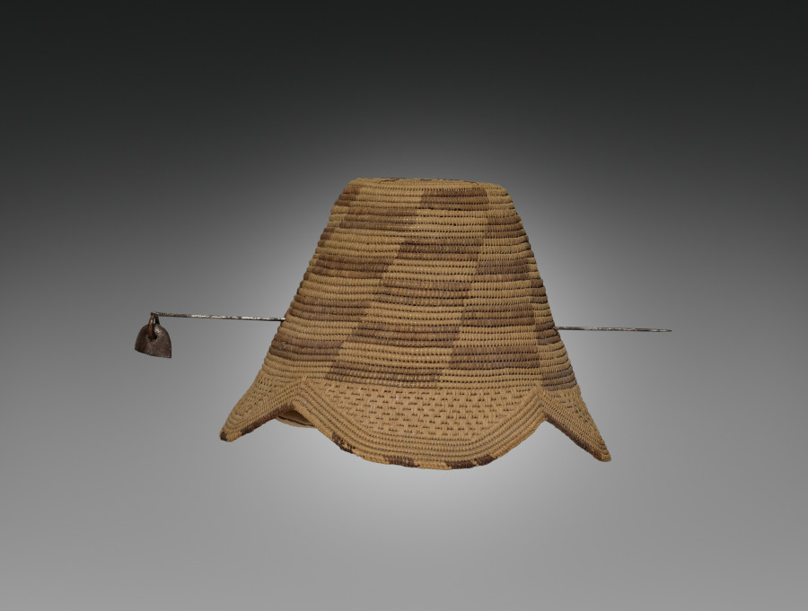 Titled Kuba men and prominent women wear the laket, a small ornate dome-shaped hat. An essential fashion item of adult men in good social standing, it focuses special attention on the head as a significant marker of individual identity, ethnic affiliation, status, and role in society. This prestige object is secured on the crown of the head with a nine-and-a-half-inch metal pin that pierces through the hat onto a clump of hair. The laket is made from raffia palm fiber coiled into threads and woven in two alternating patterns and contrasting light and dark (dyed) wefts. There are two examples of the laket: the plain type with the flat top, and the more elaborate type called the laket mishiing.
