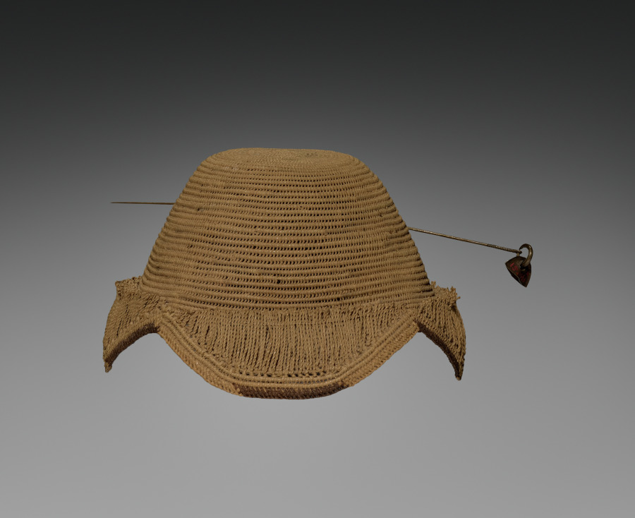 Titled Kuba men and prominent women wear the laket, a small ornate dome-shaped hat. An essential fashion item of adult men in good social standing, it focuses special attention on the head as a significant marker of individual identity, ethnic affiliation, status, and role in society. This prestige object is secured on the crown of the head with a nine-and-a-half-inch metal pin that pierces through the hat onto a clump of hair. The laket is made from undyed raffia palm fiber that was then coiled into threads and woven. There are two examples of the laket: the plain type with the flat top, and the more elaborate type called the laket mishiing.