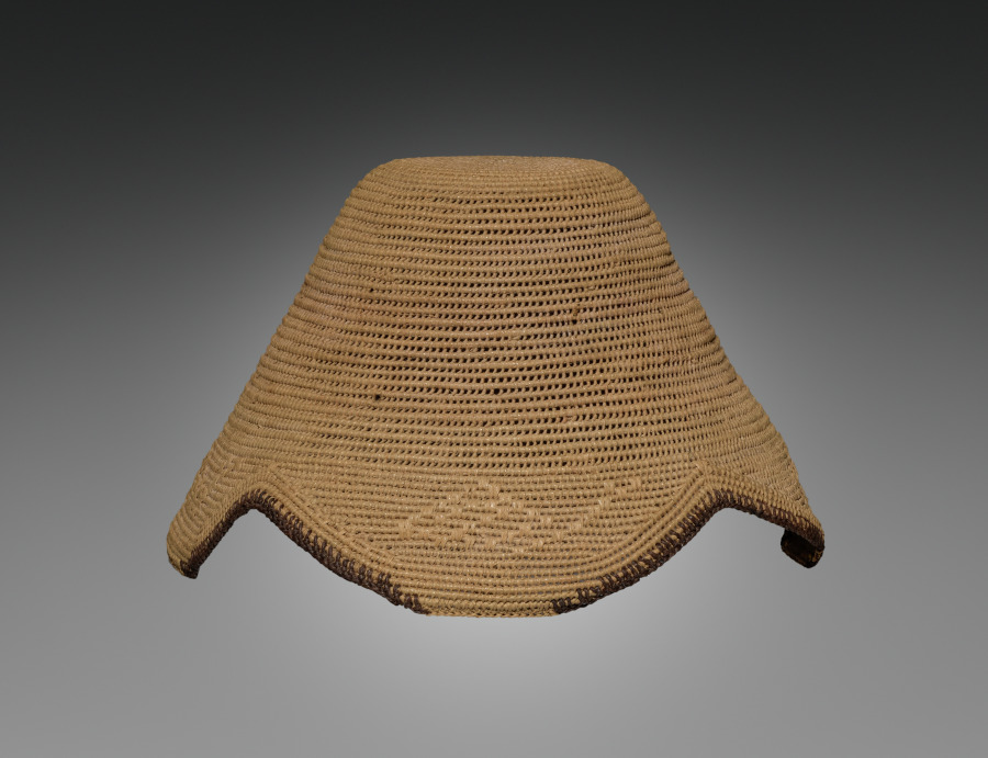 Titled Kuba men and prominent women wear the laket, a small ornate dome-shaped hat. An essential fashion item of adult men in good social standing, it focuses special attention on the head as a significant marker of individual identity, ethnic affiliation, status, and role in society. This prestige object is secured on the crown of the head with a nine-and-a-half-inch metal pin that pierces through the hat onto a clump of hair. This laket is made from raffia palm fiber coiled into threads and woven in different patterns. There are two examples of the laket: the plain type with the flat top, and the more elaborate type called the laket mishiing.