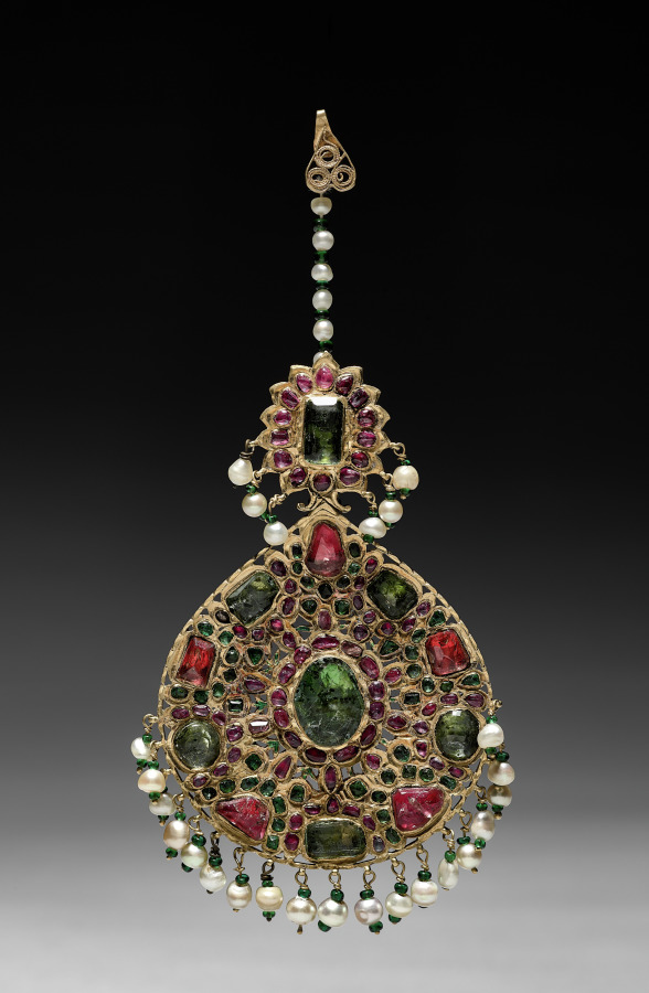 gold with emeralds and rubies, enamel and pearl pendants