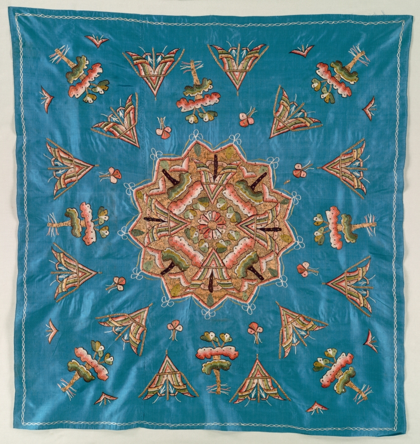 This embroidered table cover has a central medallion containing geometric motifs, which resemble closely clustered tents and trees. This is surrounded on all sides by individual tents and trees.