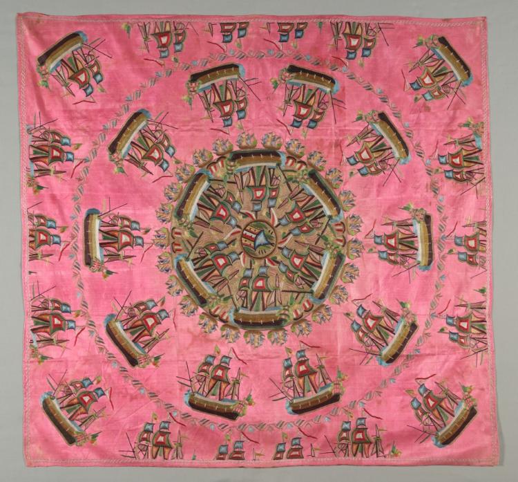 embroidery, silk and metallic threads, on silk tabby ground