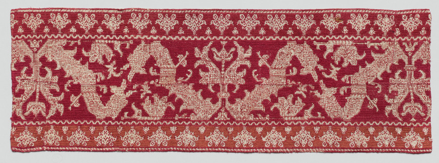 Small bands like this decorated furnishings. They are distinctive to Azemmour, Morocco, where Jewish women embroidered them at home. This band’s red designs are floral and geometric; the scrolls may be abstracted dragons. Its Renaissance-era motifs reflect centuries of cross-Mediterranean exchange (especially with Portugal, which ruled Azemmour from 1513 to 1541). Such designs traveled to North Africa via printed pattern books. Patterns were transferred onto fabric, then the backgrounds were covered with filling stitches: plait and cross-stitches were used here. The production of these embroideries ceased around the mid-1900s because of cost and changing fashions.