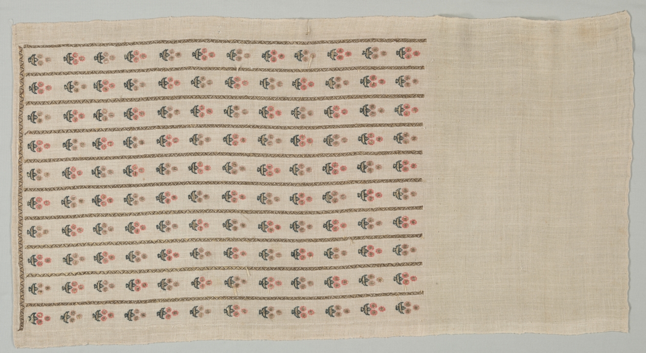 embroidery; silk and gold filé on linen tabby ground