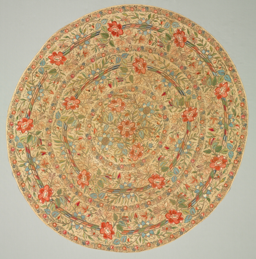 Elaborately embellished round embroideries often covered the metal trays that accompanied traditionally gracious Turkish hospitality and cuisine. Here, exuberant floral displays and garlands bearing large blossoms with shaded petals enrich the circular designs that feature extravagant gilt-metal thread and many lush colors of silk thread. The embroidered stitches almost conceal the linen ground in a spectacular tour-de-force.
