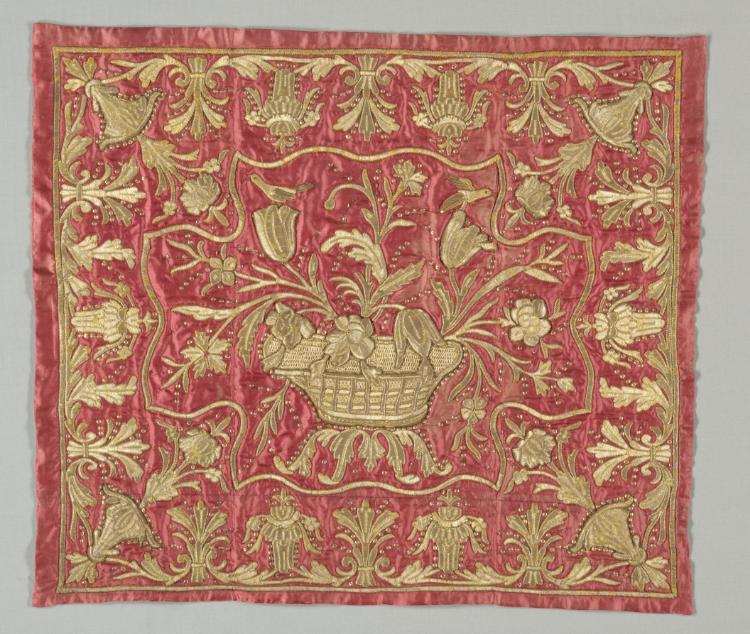 embroidery: gold filé around silk core laid over cotton, couched at edges in silk, and sequins on silk ground