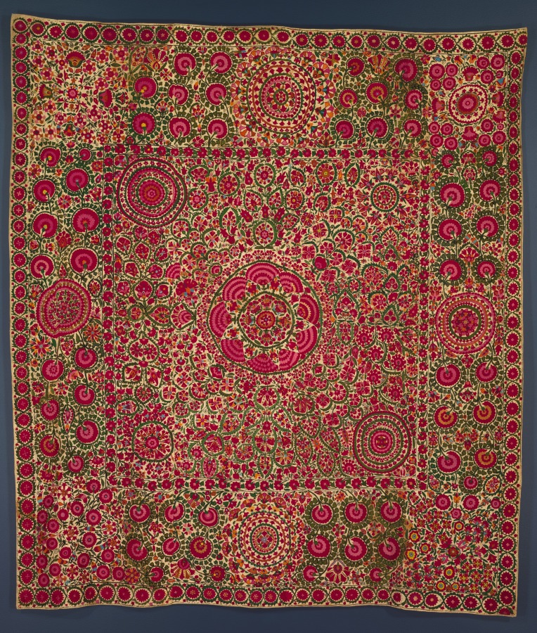 Known as suzani, embroideries with elaborate floral decoration from Central Asia were a significant part of a bride’s dowry and were ceremoniously displayed on special occasions. Women embroidered suzani, mothers passing their skills on to their daughters. Floral and foliate motifs generally dominate, emboldened with several shades of red and multiple borders, perhaps conveying cosmological, medicinal, or fertility associations. However, few display a more bountiful blossoming garden than seen here. Flora radiates from the central fanlike bouquet, a design echoed in the corners of the field and in the wide border, characteristic of work from Bukhara, Uzbekistan. Patterns were drawn on several loosely joined cotton cloths and then embroidered in chain stitch.