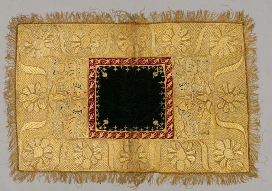embroidery: silk, metal, and cotton thread on cotton ground; silk edging and velvet appliqué