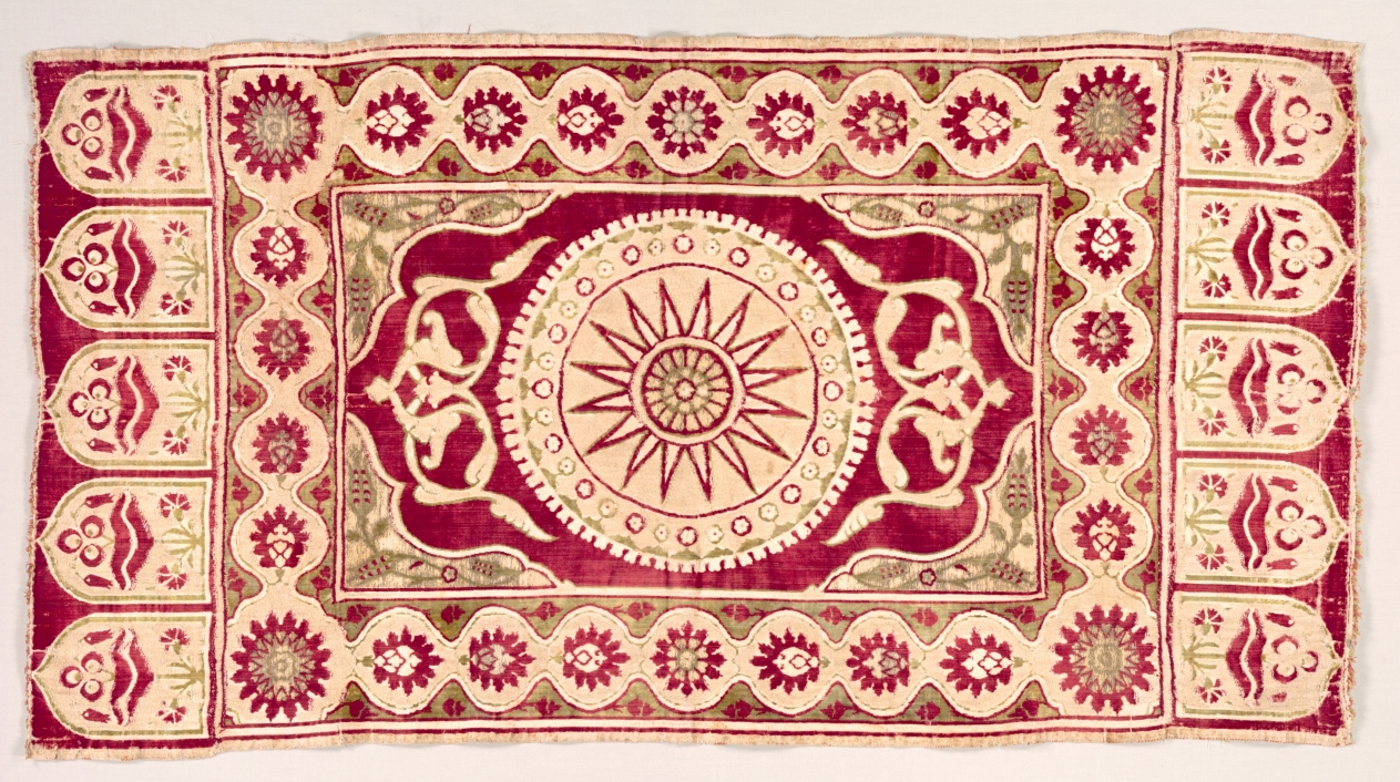 velvet; silk (formerly on silver ground, which is now worn and darned)