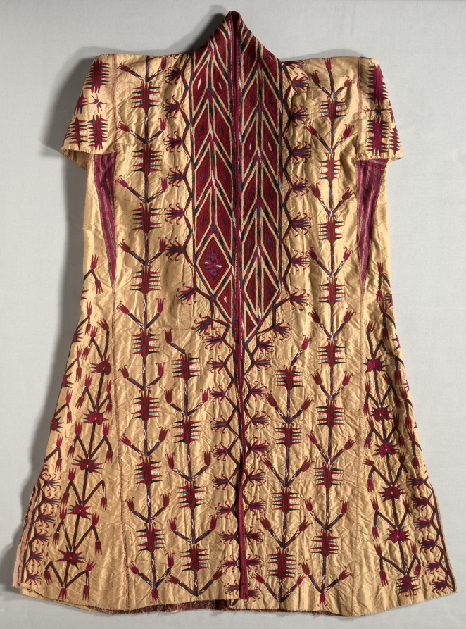 This yellow silk is richly embroidered in the button-hole stitch. The pattern of this woman's cloak resembles one of the patterns on the so-called Bokhara stripes used for fixing tents. The garment is lined with printed cotton fabric, which seems to be a product of India or Persia, and very crude block-printed cotton fabric with simple allover patterns of red and black dots and circular medallions.
