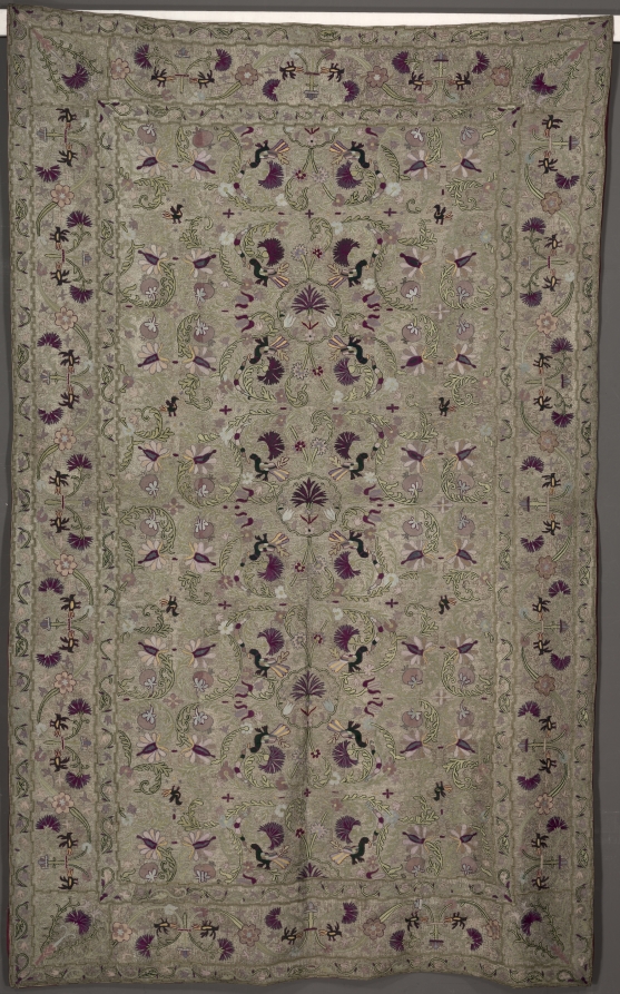 embroidery; silk and gold filé on linen