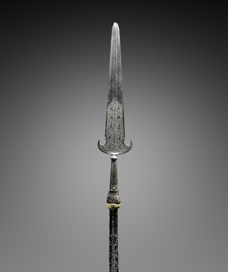 steel, etched; octagonal wood haft with studs and leather; remnants of velvet tassel