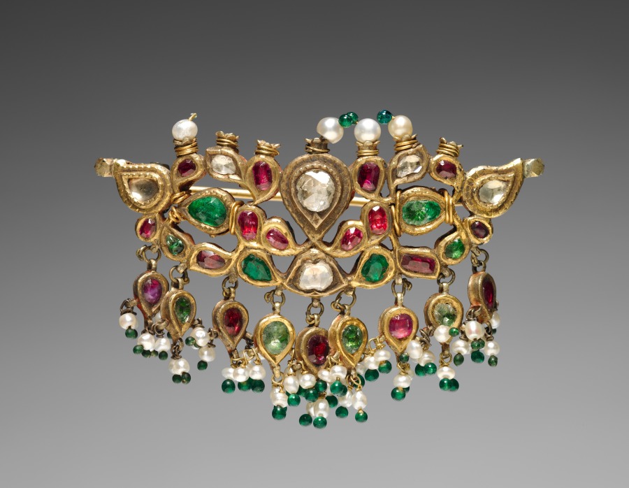 silver gilt with diamonds, emeralds, rubies and pendant pearls