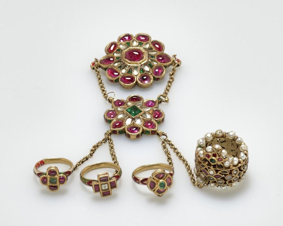 Gold with white, green, and red enamel; rubies, emeralds, clear quartz, and pearls