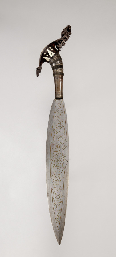 This sword’s hilt is carved from a dense Philippine hardwood known as kamagong and takes the form of a stylized cockatoo (kakatua), a motif characteristic of Tausug and Yakan sword hilts. Its broad, leaf-shaped steel blade is single-edged at the base and double-edged near the tip, making it ideal for thrusting in both warfare and ceremony.