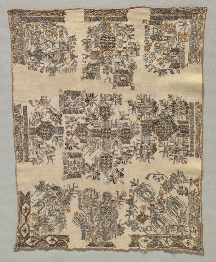 embroidery, silk and metallic threads, on silk tabby ground