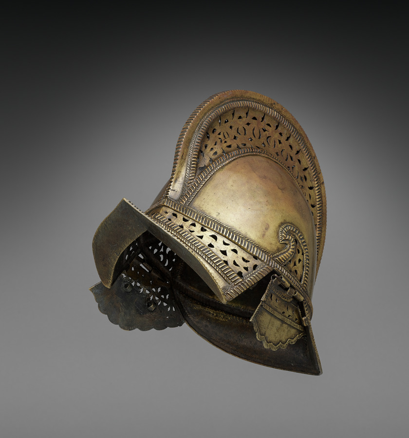 The predominantly Muslim Maranao people of the southern Philippines developed a rich material culture—including brass work, textiles, weaponry, and architecture—commonly featuring a curvilinear, geometric ornament known as okir. This helmet, while based on Spanish types, features filigree vents and openwork embellishment that are distinctively Mindanao. The top might once have been decorated with feathers or other ornaments.