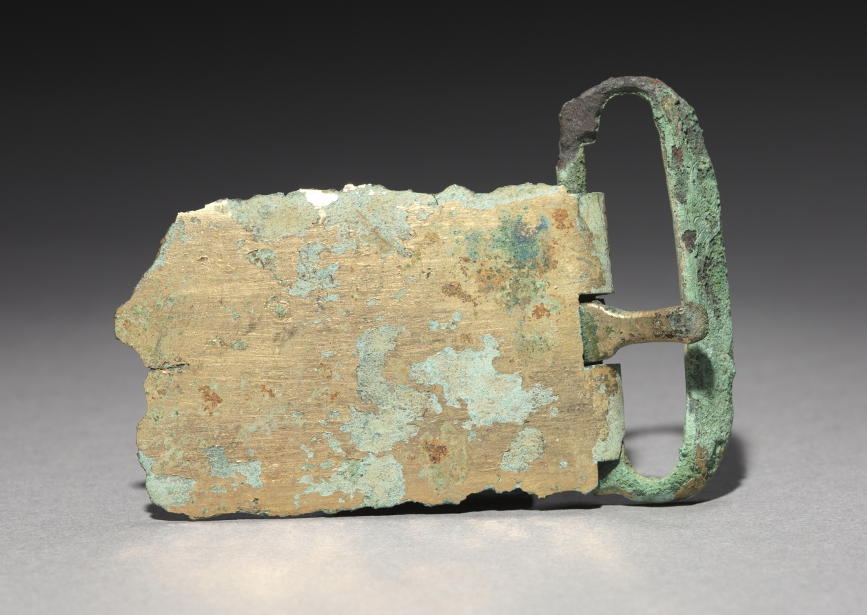 Metallurgy advanced remarkably in the Goryeo period (918-1392), explaining why a large quantity of sophisticated metal artifacts with delicate designs were used not only as daily accessories but also as burial goods. Belt buckles like this one gilded with gold were fixed to leather belts.