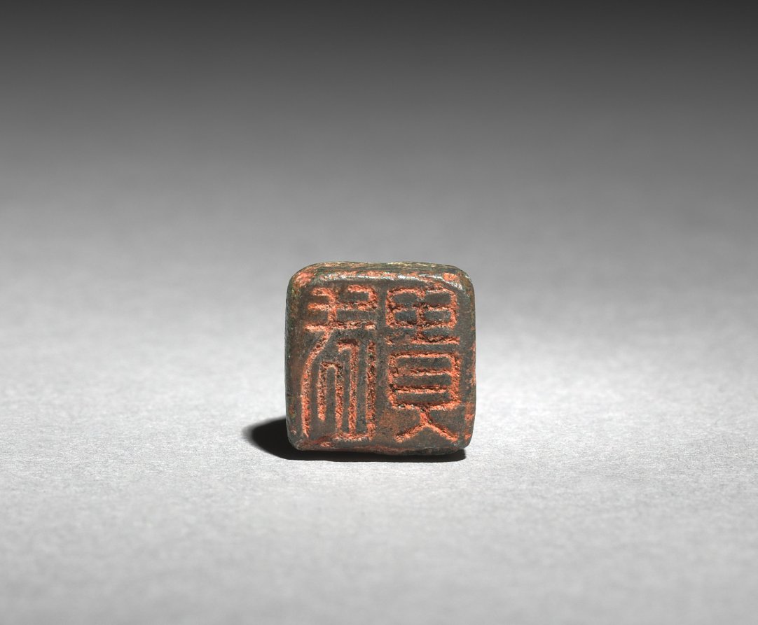 A large quantity of bronze seals were excavated from tombs of the Goryeo dynasty. This turtle-shaped seal bears two inscribed characters: 武貴, meaning "military highness." The red cinnabar paste is still visible, indicating it must have been used for signing various documents, while its owner was still alive.