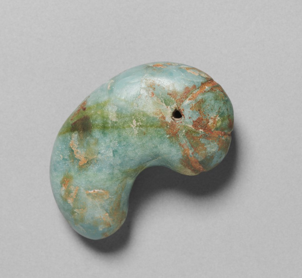 Jade is one of the hardest stones and requires an intensive, arduous process of abrasion—cutting, chiseling, grinding, and polishing—to achieve the desired shape. A grindstone and a slurry of grit and water shape the jade into the desired form, and then a cloth dampened and rubbed with finer grit may have been used to give the jade the smooth surface. For the Silla kingdom (57 BC–985), in particular, comma-shaped jades served as an essential item for the burials of the ruling class and were luxurious accessories to decorate golden crowns. Their comma shape is thought to represent embryonic forms, symbolizing life, particularly rebirth in the afterlife.